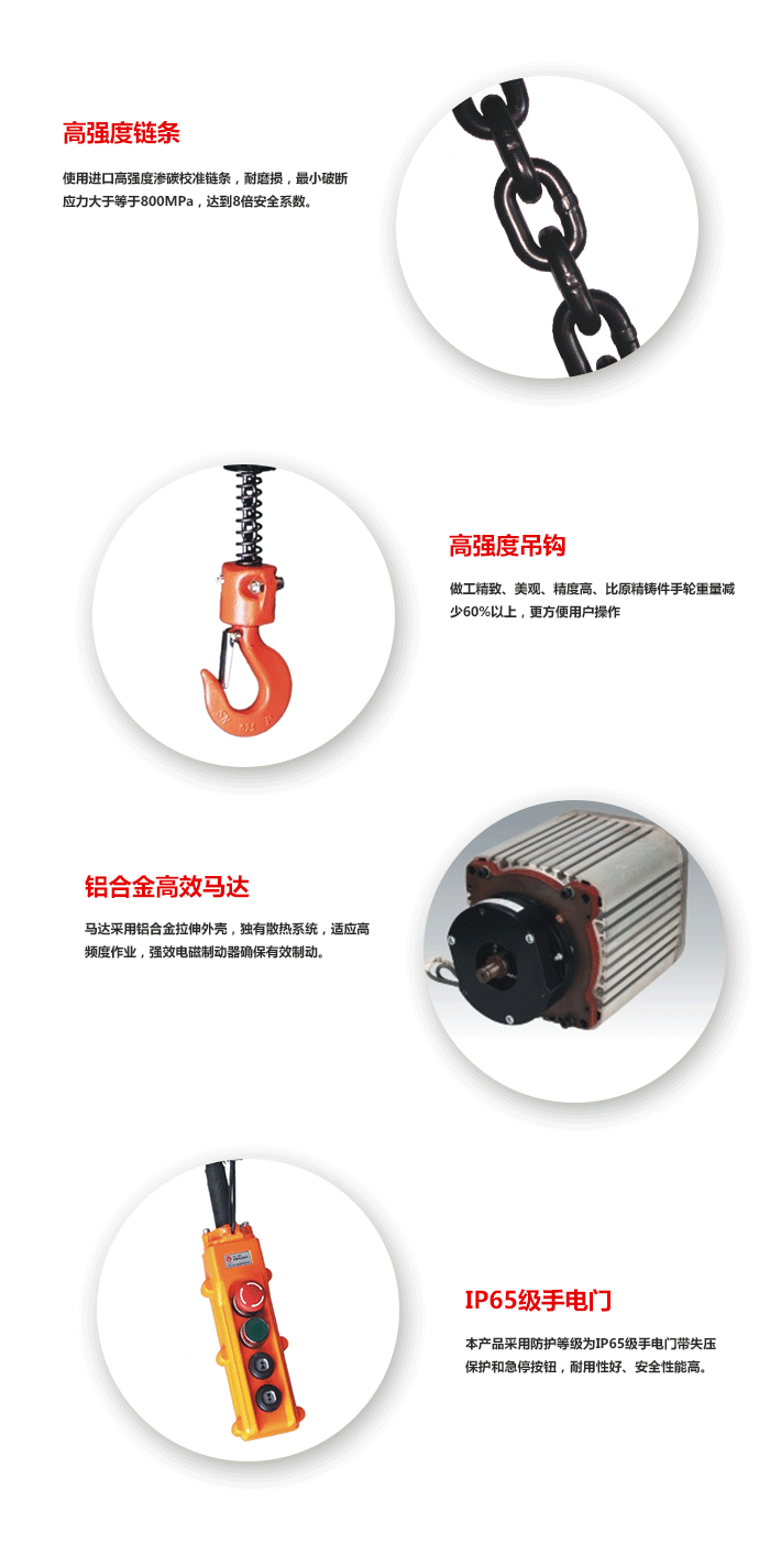 3、零部件強度高本機主要零部件均采用高級合金鋼材料,并經多道特殊熱處理工藝加工,具有強度高、耐磨性好等特點;上、下吊鉤采用高強度合金鋼制作,經強化熱處理后具有很高的韌性,即使機體因超載引起破壞,吊鉤也只會產生朔性變形而不會發生脆性斷裂。
