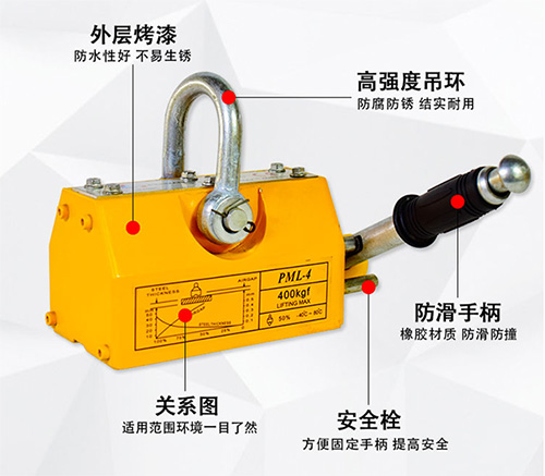安全系數高,最大拉脫力是額定起重力的 2.8-4 倍。手動型永磁起重器手柄開關附有安全鈕,可單手操作,方便安全。起重底面“ V ”型槽設計。全自動永磁起重器無需人力扳動手柄,靠電動吊車下鉤的升降控制吸附,可起吊相對應的圓鋼、鋼板,不用電,使用安全,廣泛用于鋼材的起重搬運,平整的機械零部件及各種模具的安裝和搬運。