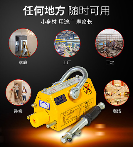 適用于造船、工程機械、汽車等行業常溫鋼板起吊、搬運等作業的起重工具。 主要用于吊裝過程中與被吊裝工件的連接,(比如:和環鏈電動葫蘆,鋼絲繩電動葫蘆等配套)用于移動鐵板、塊和圓柱形導磁材料的工作。操作方便、安全可靠、結果緊湊輕巧。廣泛應用在工廠、碼頭、倉庫、交通運輸行業中。改進裝卸搬運作業的工作條件,提高勞動效率。