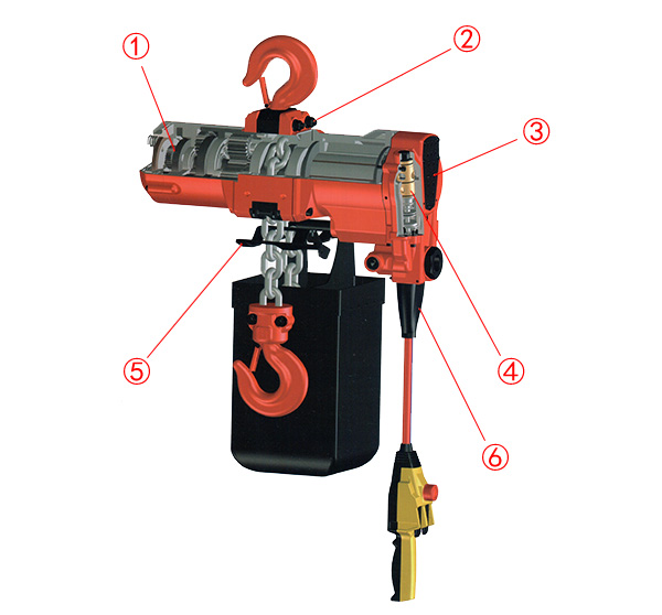 ① 高耐用性齒輪箱,符合M4級別耐用要求;② 上吊鉤易拆裝;③ 獨特排氣接口設計、可連接管路將排氣引出;④ 高可靠性換向閥組,可防止漏氣;⑤ 低高度,最大限度滿足狹小空間使用;⑥ 氣管保護套;