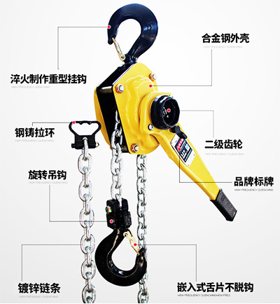 構造優秀,應用可以信賴,堅固耐用。整個設備高效率,使用方便、舒服。重量輕,重量輕,攜帶方便。所有為結構鋼。特等的鋁合金傳動鏈條。所有為傳動齒輪旋轉。傳動齒輪和軸的旋轉處常有滾動軸承或軸套。商品表層歷經靜電噴塑解決。技術專業的鋁合金鉤可以滿足商品的超重。商品能考慮額定值荷載的150%的凈重。